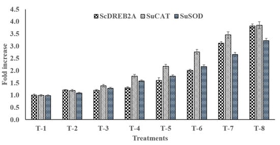 To analyze the gene expression pattern of stress-related genes in sugarcane, qRT-PCR was performed. In brief, the total RNA from all treated sugarcane plant leaves was extracted by Trizol reagent (Invitrogen, Carlsbad, CA, USA), following the manufacturer’s instructions. Extracted RNA was spectrophotometrically quantified and reverse-transcribed into cDNA through PrimeScriptTM RT Reagent Kit (TaKaRa, Shiga, Japan, China), following the manufacturer’s instructions. Further RT-PCR was performed with a final 20 µL reaction mixture, containing 2 µL of 10-fold diluted first-strand cDNA, 10 pM of sugarcane stress-specific primers of ScDREB2A, SuCAT, and SuSOD (Supplementary Table S1), and 10 µL of SYBR Premix Ex TapTMII (Takara, Kyoto, Japan). All RT-qPCR reactions were performed in a real-time PCR system (Bio-Rad, Hercules, CA, USA) with the following programming: initial denaturation at 95 °C for 3 min, followed by 35 cycles of 95 °C for 15 s, 58 °C for 30 s, and 72 °C for 30 s, with a subsequent melting cycle from 60 to 95 °C. All RT-qPCR reactions were performed with reference gene GAPDH in three replicates. To compare relative expression, the delta–delta CT method was used.