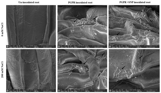 The results of biofilm formation showed that SNP significantly increases the biofilm formation capacity of the strain ASN-1. Under unstressed conditions, SNP increases biofilm formation capacity 40.98% more than non-SNP treated culture. Under salt stress conditions, SNP treatment increased the biofilm formation by 49.9 and 37.4% at 5 and 10% NaCl concentrations, respectively, compared to the non-SNP-treated salt-stressed culture (Figure 4). Thus, the results indicate that SNP induced higher biofilm formation, strengthening effective root colonization.