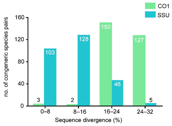 Mean and standard deviation (s.d.) of the percentage sequence divergences of CO1 or SSU rRNA genes for congeneric species pairs within three genera. (The percentage of sequence divergence estimates falling in a particular range is also shown. n indicates the number of congeneric pairs examined in each genus).