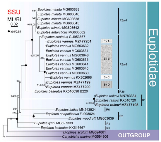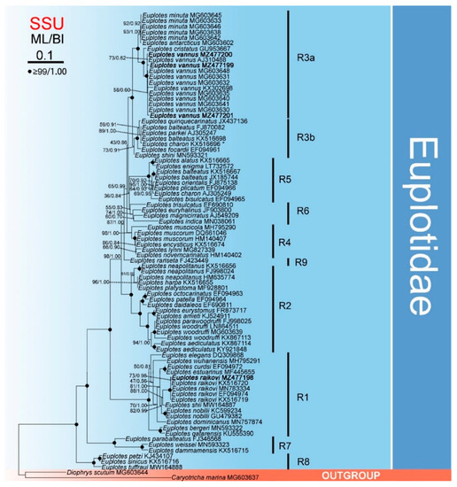 Maximum likelihood (ML) tree inferred from SSU rDNA sequences showing nodal support for ML and BI analyses. Newly sequenced species are shown in bold. A hyphen (−) reflects disagreement in topology between the BI and ML trees. R1–9 represent different clades. The scale bar corresponds to 10 substitutions per 100 nucleotide positions. * misidentification, should be Euplotes balteatus.