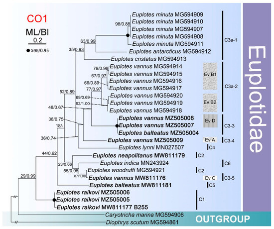 The ML and BI trees based on the CO1 gene sequences of ten Euplotes species (27 isolates) had similar topologies, therefore only the ML tree is shown here (Figure 4). However, the topology of this tree is somewhat different to that of the equivalent SSU rDNA tree (Figure 3). For easier orientation, clades on the phylogenetic tree were numbered as in the SSU rDNA tree and differed only in the letter (R—for SSU rDNA (Figure 2 and Figure 3), C—for CO1 (Figure 4)). In total, ten clusters were recovered (Figure 4).