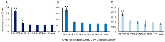 Detection of S1 proteins in UVB-inactivated SARS-CoV-2. Because a SARS-CoV-2 virus contains single-stranded RNA, the RNA copies in the x-axis correspond to the number of viruses. Three datasets measured by 3 investigators are presented as (A–C). The absorbance was obtained from a 60 min cycling reaction time. Each investigator performed 3 replicate experiments. Error bars indicate the standard deviation. The 3 investigators consistently obtained signals that were higher than the blank at concentrations over 2.6 × 106 RNA copies/assay. * p < 0.05, ** p < 0.01 compared with the value of blank by one-way ANOVA with a post-hoc Tukey test.