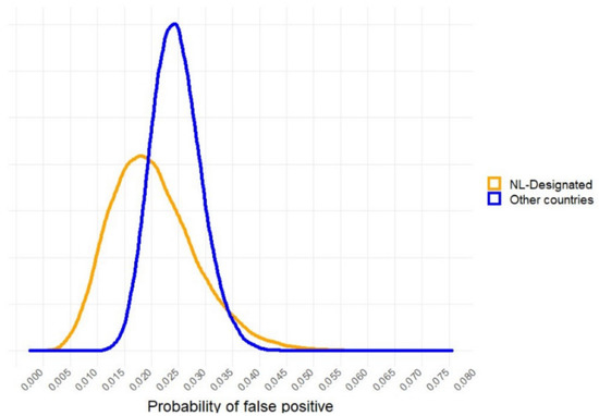 Based on the number of false positive (fp) and the total number of negative samples tested (to) during proficiency testing in Table 2 (for the NVWA-designated laboratories) and Table 3 (from several countries), we used a beta distribution to describe the uncertainty around the estimate of probability of false positive (pp): pp~Beta(fp + 1; to-fp + 1) [18]. For the NVWA-designated laboratories, the mean probability of false positive testing during proficiency testing by a laboratory is 0.025 ranging from 0.011 to 0.044 (95% confidence interval). For other countries, it is 0.027 ranging from 0.019 to 0.037 (95% confidence interval). False positive probabilities higher than 0.05 and lower than 0.003 are rare in both the NVWA-designated laboratories and in other countries (Figure 1).