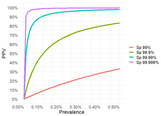 Relationship between the positive predictive value (PPV) of a positive test result and prevalence of a disease. For calculations, test specificities (Sp) from 99% to 99.999% and a test sensitivity (Se) of 99%, when the within-flock prevalence is higher than 10%-were used.