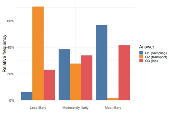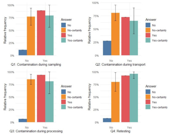 A questionnaire about the potential for cross-contamination of samples was sent out to poultry veterinarians of the Poultry Veterinary Study Group of the European Union (www.pvsgeu.org (accessed on 3 September 2021)). Members of this group are selected expert poultry veterinarians from the following 22 European countries: Austria, Belgium, Bulgaria, Cyprus, Denmark, Finland, France, Germany, Great Britain, Greece, Hungary, Ireland, Italy, Latvia, Netherlands, Norway, Poland, Portugal, Romania, Spain, Sweden, and Switzerland. The following questions were asked: In your experience as a poultry practitioner: (Q1) do you think that it is possible to get a false positive Salmonella result from a farm because samples taken by the farmer have become contaminated through cross-contamination during sampling? (Q2) do you think that it is possible to get a false positive Salmonella result from a farm because samples taken by the farmer have become contaminated through cross-contamination during transport of the samples from the farm to the laboratory? (Q3) do you think that it is possible to get a false positive Salmonella result from a farm because samples have become contaminated through cross-contamination in the process of handling and isolation in the lab? (Q4) Do you think that, given the existence of false positive Salmonella results in practice, it is important that all initial positive Salmonella results from a farm are confirmed by resampling and retesting from the same barn and farm? For each answer by a responder, the likelihood of the chosen answer (yes or no) is asked on a scale from 0 (not sure) to 10 (very sure). The last question was: If you have answered questions Q1 to Q3 with “Yes”, what would be your ranking of the likelihood of the appearance of false positives? The details of the questionnaire are depicted in Supplementary material A.