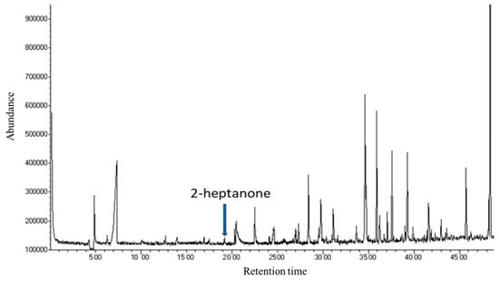 This study aimed at the identification and quantification, in bacterial culture filtrates, of 2-heptanone, whose protective role against honey bee pathogens has been previously reported []. The GC-MS analysis of CFS from the selected bacterial strains revealed a complex mixture of volatile compounds; among them, 2-heptanone was found at the retention time of 19.10 min (Figure 1). The gas chromatographic profile comprised many other compounds potentially interesting for their bioactivity; among which were 2,5-dimethylpyrazine at a retention time of 20.46 min, phenyl methanol (retention time of 26.90 min) and phenyl ethanol (retention time of 31.13 min). Interestingly, ant-associated bacteria have been reported to produce volatile pyrazines, including 2,5-dimethylpyrazine, previously identified as ant trail and alarm pheromones []. These compounds will be the object of further investigations on bioactive volatiles produced by hive-associated bacteria. Most of the other identified peaks are referred to as volatile fatty acids produced by microbial fermentation.