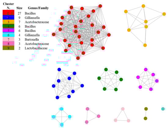 Sequence Similarity Network (SSN) showing the relationships among the protein sequences of putative homologs of methylketone synthase in bacterial species inhabiting apiaries. The most related proteins are grouped together in clusters. The singleton was constituted by the sequence of Lycopersicon hirsutum included in the dataset as the reference of a methylketone synthase described in plants.