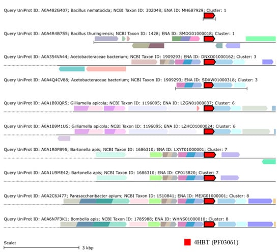 GNDs representing genomic regions around the genes encoded for the sequences from the submitted SSN highlighted the presence of two main protein families in the analyzed sequences: the 4HBT Thioesterase superfamily (PF03061), shared by clusters 1 (Bacillus), 3 (Acetobacteraceae), 6 (Gilliamella), 7 (Bartonella) and 8 (Acetobacteraceae) (Figure 5), and the 4HBT_2 Thioesterase-like superfamily (PF13279), shared by clusters 2 (Gilliamella), 4 (Bacillus) and 5 (Bacillus). The Acyl-ACP thioesterase (PF01643) protein family was found in Lactobacillaceae from cluster 9, suggesting that this family may have evolved separately. The fact that those thioesterase superfamilies were shared by different taxonomic groups, together with the high similarities of these sequences, reinforces the possibility of finding methylketone synthase homologs in the selected bacterial taxa. From a practical point of view, the presence of a conserved protein family putatively involved in the biosynthesis of methylketones in different bacterial taxa suggests the possibility of using this sequence fragment as a target when aiming at assessing the biosynthetic potential of 2-heptanone in apiaries.