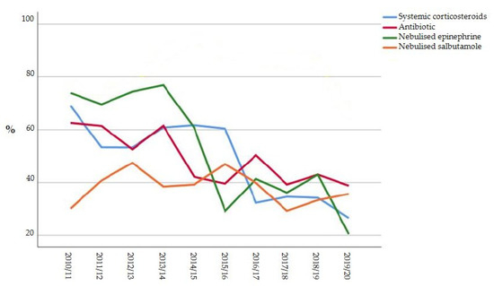 - House, S.A.; Marin, J.R.; Hall, M.; Ralston, S.L. Trends Over Time in Use of Nonrecommended Tests and Treatments Since Publication of the American Academy of Pediatrics Bronchiolitis Guideline. JAMA Netw. Open 2021, 4, e2037356. [Google Scholar] [CrossRef]
