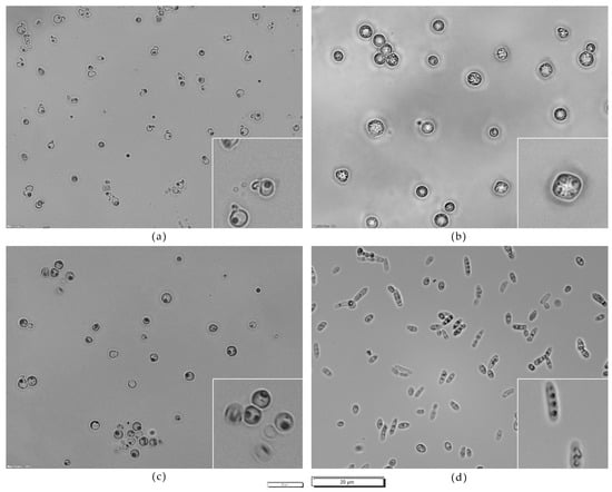 Optical microscopy of representative strains: (a) C. dubliniensis CCY 29-178-1, (b) D. hansenii 5-1-6, (c) H. uvarum 9-2-1, (d) L. thermotolerans 5-1-3, (e) M. aff. chrysoperlae 11-1-4, (f) M. pulcherrima 125/14, (g) M. pulcherrima 11-1-7, (h) M. guilliermondii 12-5-1, (i) P. fermentans 12-4-4, (l) P. kluyveri PDA W 9, (m) S. cerevisiae 60/16, (n) T. delbrueckii 21-1-5, (o) T. delbrueckii 3-16-1, (p) Z. bailii 24-1-25. Magnification 40×; scale 20 µm.