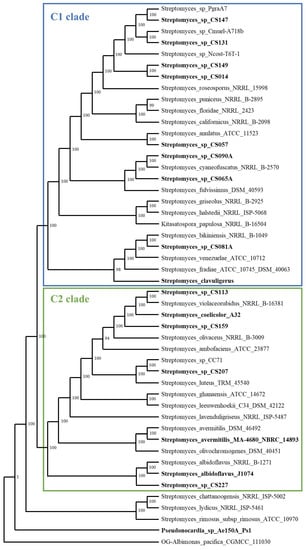 Two different clades could be inferred from the tree: C1 included most of the CS strains and the reference strain S. clavuligerus, and C2 that comprised CS113, CS159, CS207 and CS227 strains together with the well-known reference strains S. coelicolor, S. avermitilis and S. albidoflavus. According to this data, strains from the C1 clade are potentially more attractive candidates for new drug discovery screenings since they were less related to Streptomyces strains commonly used for secondary metabolite analysis (Figure 1).