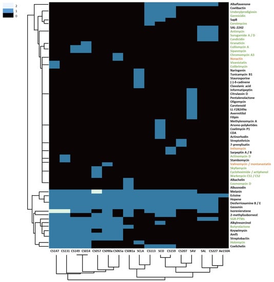Another interesting observation was that the BGC for γ-butyrolactone is usually predicted to cluster together with other BGCs. γ-Butyrolactones are quorum-sensing molecules that have been described in different strains of Streptomyces [36]. These molecules are known to regulate secondary metabolism in Streptomyces [37,38,39,40] and its biosynthetic genes are widely extended throughout this genus [36]. In the case of coelimycin gene cluster, genes for γ-butyrolactone biosynthesis are located and included within the coelimycin BGC, since they participate in its regulation [41,42,43,44,45]. Thus, this BGC was not contemplated in our heatmap as butyrolactone BGC when predicted to be linked to another cluster. These clusters were included in the hybrid-other category.