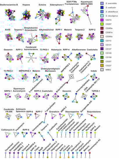 Among the 42 known different metabolites potentially produced by the CS strains (according to antiSMASH), 21 were detected and identified by dereplication. The remaining 21 compounds that were not detected by dereplication were mainly classified as siderophores, terpenes, lanthipeptides, lasso peptides, lipopeptides, ectoine, butyrolactone and melanin. Our inability to detect these compounds could be due to two different reasons: (i) they were not being produced under our laboratory conditions or (ii) the extraction method using ethyl acetate is not suitable for this type of metabolites, and other solvents (e.g., n-butanol or ethanol) should be used instead [49,50,51,52].
