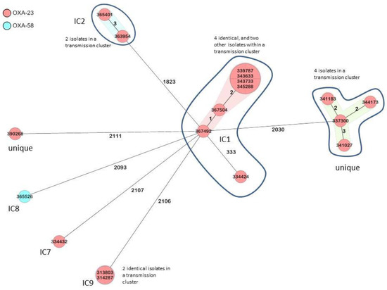 A minimum spanning tree of the A. baumannii strains based on 2390 target alleles (core genome) is presented. The study I.D.s of the isolates are shown within the nodes, and the numbers between the nodes indicate the number of alleles that were different. Isolates, which are elements of transmission clusters, are either shown within the same node or connected with transparent bands. Isolates are colored based on the detected blaOXA gene.
