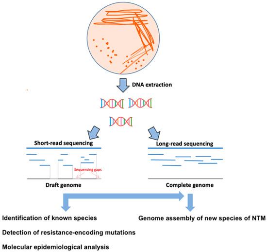 Schematic representation of the WGS methodological procedure. In the first step, DNA is extracted from colonies grown on a solid or liquid culture medium. Subsequently, sequencing libraries are prepared for short- or long-read sequencing. In the last step, the sequencing data are bioinformatically processed for genotyping, identification of resistance patterns, molecular-epidemiology analysis, and assembling of complete genomes of new NTM species.