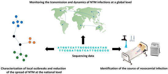 The contribution of WGS in the molecular epidemiology of NTM infections. Sequencing data can be used to describe the global spread and dynamics of NTM infections, to characterize local outbreaks, and also to identify sources of infection in hospital settings.