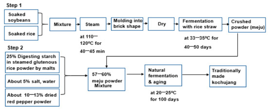 TMK is generally made using a two-step fermentation method: (1) the fermentation of a dried brick-shape of steamed soybeans with rice straw at 33–35 °C for 40–50 days and crushed into powder (meju powder); (2) and the natural fermentation and aging of the mixture of 25% the degraded starch in glutenous rice powder with malt, 10–13% red pepper, 57–60% meju powder, and 5% salts outside at approximately 20–25 °C for over 100 days (Figure 1) [4].