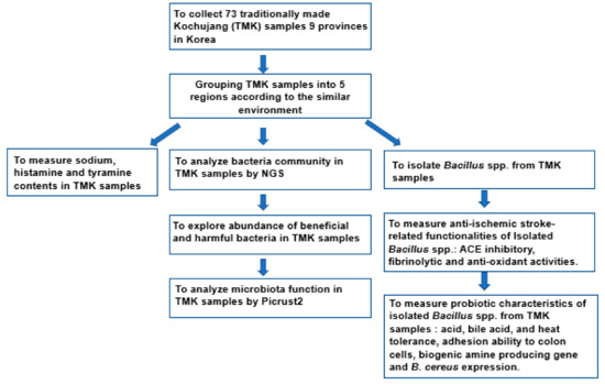 Overall, TMK from all areas in Korea exhibited sustainable quality control, but KS TMK must increase beneficial bacteria in the present study. TMK should maintain optimal quality control to increase various beneficial bacteria and to not contain harmful bacteria and biogenic amines. Several B. subtilis, B. amyloliquefaciens, and B. velezensis had anti-cerebrovascular disease activity, including increasing fibrinolytic, antioxidant, and ACE inhibitory activity. The isolated ones can be applied to make functional Kochujang as a starter culture. The inoculated Kochujang can be registered as a functional food having anti-cerebrovascular disease activity in the Korean Food and Drug Administration after its efficacy and mechanism are confirmed in animal and human studies in the near future.