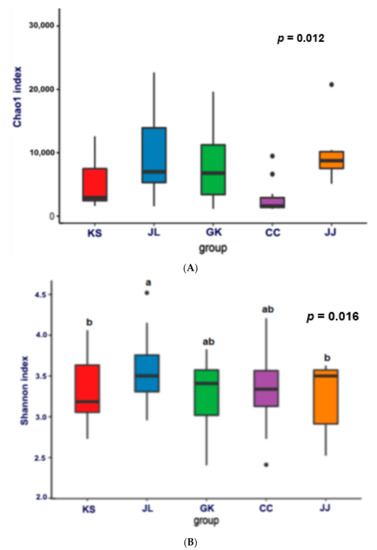 The α-diversity was determined using the Chao1 and Shannon index representing bacterial richness in TMK. The TMK samples from JL and JJ showed the highest Chao1 index. CC had the lowest index among the groups (p = 0.012; Figure 3A). The Shannon index also showed a similar trend to the Chao1 index. The Shannon index of JL and JJ was higher than the other groups (p = 0.016; Figure 3B).