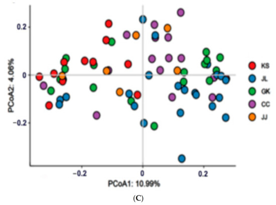 The β-diversity, a measure of similarity and dissimilarity of bacterial communities, was significantly different among the TMK of five different provinces (p = 0.003; Figure 3C). The bacterial communities of KS were separated from those of JL, JJ, and CC. The PCoA1 and PCoA2 axis explained 10.99% and 4.06% of bacterial diversity of all TMK samples (Figure 2C).