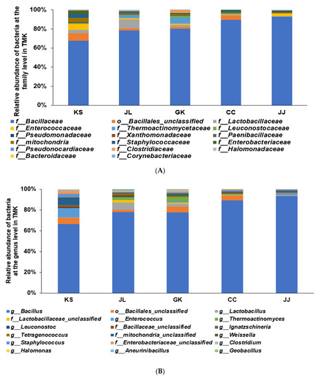 Among TMK from different provinces of Korea, bacterial communities of KS were different from those of other TMK samples. KS had a much lower Bacillaceae (~65%) than the other TMK in the family level, while TMK in JJ and CC had approximately 90% Bacillaceae, and JL and GK contained approximately 80% (Figure 4A). Interestingly, TMK in JL and GK contained approximately 9.3 and 4.4% Lactobacillaceae, whereas those in other provinces had less than 1% (Figure 4A). KS included much less Bacillus and higher Enterococcus and Staphylococcus at the genus level than the other TMK, but JL and GK contained much higher Lactobacillus than the TMK. CC and JJ contained more than 90% Bacillus (Figure 4B).