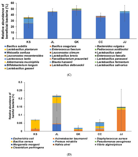 TMK contained 35 beneficial bacteria, and the primary beneficial bacteria were B. subtilis in all TMK. On the other hand, KS (26%) did not include B. subtilis as much as TMK from other provinces (~40%) (Figure 4C). Interestingly, KS contained 7% Enterococcus and E. faecium, but the other TMK did not include it as much. Other beneficial bacteria in TMK were B. subtilis, B. coagulans, Bacteroides vulgatus, Lactobacillus plantarum, Enterococcus faecium, Pediococcus acidilactici, and Weissella confuse (Figure 4C).