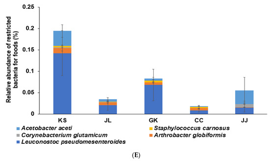 On the other hand, TMK contained harmful bacteria, including Escherichia coli, Acinetobacter baumannii, Staphylococcus aureus, B. cereus, Proteus mirabilis, Pseudomonas aeruginosa, Morganella morganii, and Hafnia alvei. JL contained the highest harmful bacteria among the TMK groups (Figure 4D). On the other hand, the mean contents of harmful bacteria in five TMK groups were less than 0.1% in all TMK groups except Acinetobacter baumannii in JJ and Staphylococcus aureus in JL TMK also contained B. cereus in all five TMK groups, but their contents were less than 0.1%. KS and JL contained B. cereus more than the other groups (Figure 4E). TMK included restricted bacteria for foods, including Leuconostoc pseudomesenteroides, Arthrobacter globiformis, Corynebacterium glutamicum, Staphylococcus carnosus, and Acetobacter aceti. KS contained restricted bacteria for foods, particularly Leuconostoc pseudomesenteroides and Acetobacter aceti, the most among the five TMK groups (Figure 4E). However, the total contents of harmful and restricted bacteria were less than 0.5% of TMK and can be acceptable for foods.