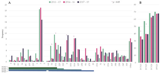 Changes in the serotype distribution of pneumococci causing pneumococcal pneumonia by period. (A) Individual serotypes; (B) Frequency of episodes caused by serotypes included in pneumococcal vaccines. Asterisks indicate significant changes between 2011–2013 and 2017–19. Lines below the serotypes indicate the serotype composition of the different vaccines. PCV13: 13-valent pneumococcal conjugate vaccine (PCV); PCV15: 15-valent PCV; PCV20: 20-valent PCV; PPV23: 23-valent pneumococcal polysaccharide.