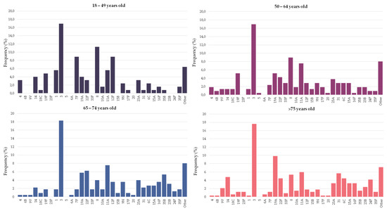Figure 2 and Table 1 show the serotype distribution by age group. Serotype 3 was the most frequent serotype in all age groups (range 17–18%). Serotypes 4, 7F, 8, 12F and 19F were statistically more represented in people younger than 65 years old and accounted for 27% of the episodes (11% for people ≥65 years old). Among these serotypes, serotype 8 alone accounted for 10% of the episodes in younger adults (5% in people ≥65 years old). On the other hand, serotypes 19A, 16F and 24F were more commonly found in older adults, accounting for 15% of the episodes (6% in younger adults). In the last period (2017–2019), the putative coverage of the different pneumococcal vaccines were higher in adults aged 18–64 years old than among people over 65: PCV13 (42% vs. 38%), PCV15 (48% vs. 44%), PCV20 (72% vs. 61%, p < 0.001) and PPV23 (77% vs. 64%, p < 0.001).