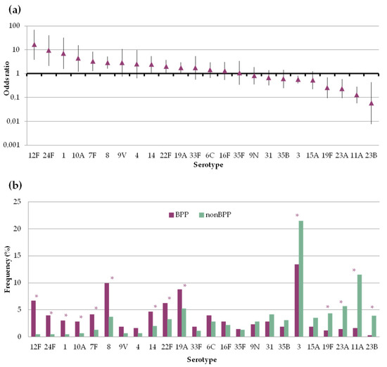 Frequency of pneumococcal serotypes in bacteremic (BPP) and non-bacteremic pneumonia (non-BPP). Only serotypes accounting for ≥10 episodes are shown (a) Serotype specific odds ratio and 95% CI comparing BPP and non-BPP. (b) Serotype distribution of pneumococci causing BPP or non-BPP. Asterisks indicate statistically significant changes (p < 0.05).