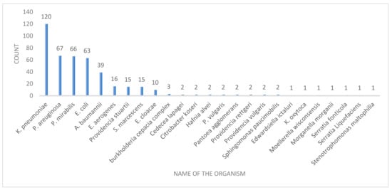 The majority of infections occurred in the first quarter of the year (47.4%), which could be explained by the fact that infection rates are higher in the winter months because of many factors, such as crowding of people at home, inadequate ventilation, low vitamin D levels, dry air, and decreased physical activity []. We observed that the majority (76.7%) of the isolates were Gram-negative, and only 27.3% were Gram-positive isolations. A total of 55.0% of the infections were noted in males, and 35.0% of the infections occurred in patients above 75 years of age (Table 1). Gram-negative infections were more frequently observed in males (50.6%) and in patients aged more than 75 years (32.3%) (Table 2). Ibrahim observed in 2018 that 81% of the isolates were Gram-negative, and male patients (59.7%) were predominant in that study []. The predominance of Gram-negative isolates in older male patients admitted to ICUs has been observed in studies conducted by Bianco et al., Sligl et al., and Lachhab et al. [,,]. Males are generally more prone to infections than females, due to differences in the sex steroids as well as imbalance of sex-chromosome-linked genes []. The increased incidence in older age groups may be due to their defective defense mechanisms and deteriorating immune systems [,].