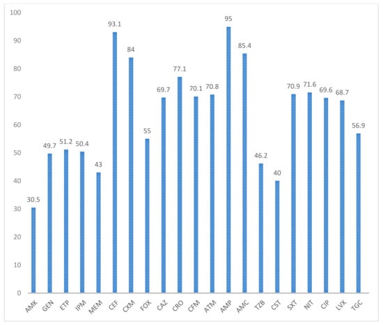 The antibiotic panel consisted of amikacin (AMK), gentamicin (GEN), ertapenem (ETP), imipenem (IPM), meropenem (MEM), cephalothin (CEF), cefuroxime (axetil or sodium) (CXM), cefoxitin (FOX), ceftazidime (CAZ), ceftriaxone (CRO), cefepime (FEP), aztreonam (ATM), ampicillin (AMP), amoxicillin/clavulanic acid (AMC), piperacillin/tazobactam (TZP), colistin (CST), trimethoprim/sulfamethoxazole (SXT), nitrofurantoin (NIT), ciprofloxacin (CIP), levofloxacin (LVX), and tigecycline (TGC).
