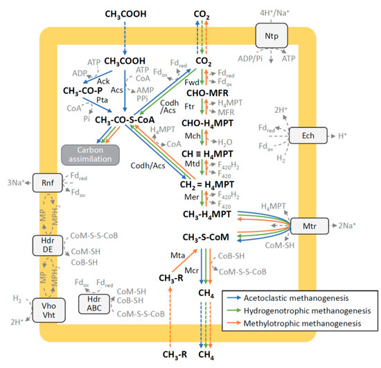 Central catabolic pathways in methanogens. Arrows are color-coded according to types of methanogenesis. Catabolic steps widely distributed to respective types of methanogens are included. Abbreviations are as follows: Fdox/Fdred, oxidized and reduced ferredoxin; MP/MPH2, oxidized and reduced methanophenazine; CoB-SH, coenzyme B; CoM-SH, coenzyme M; CoM-S-S-CoB, mixed disulfide of CoM-SH and CoB-SH; F420/F420H2, oxidized and reduced factor 420; H4MPT, tetrahydromethanopterin; Fwd, formylmethanofuran dehydrogenase; Ftr, formylmethanofuran:H4MPT formyltransferase; Mch, methenyl-H4MPT cyclohydrolase; Mtd, F420-dependent methylene-H4MPT dehydrogenase; Mer, methylene-H4MPT reductase; Mtr, methyl-H4MPT:coenzyme M methyltransferase; Mcr, methyl-coenzyme M reductase; Hdr, heterodisulfide reductase; Ech, energy-converting hydrogenase; Vho/Vht, F420 non-reducing hydrogenase; Acs, acetyl-CoA synthetase; Ack, acetate kinase; Pta, phosphotransacetylase; Codh/Acs, CO dehydrogenase/acetyl-CoA synthase; Mta, methyltranferase; Ntp, proton or sodium-translocating ATPase; Rnf, sodium-translocating complex.
