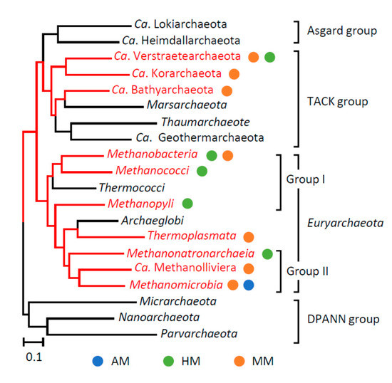 A phylogeny tree showing relationships among class-level phylogenetic groups in the domain Archaea, in which lineages that include methanogens are indicated in red. Circles with different colors indicate types of methanogens. The tree was constructed using the maximum-likelihood algorithm based on amino acid sequences of concatenated ribosomal proteins. AM, actoclastic methanogen; HM, hydrogenotrophic methanogen; MM, methylotrophic methanogen.
