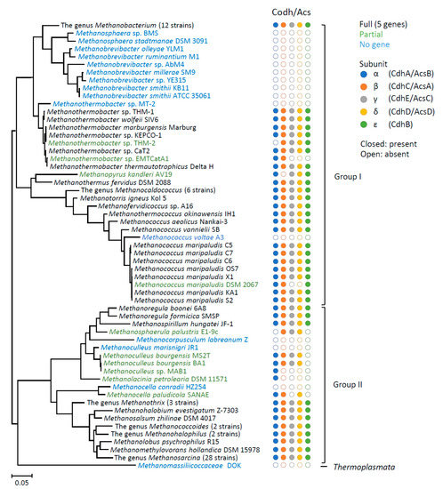 In order to deepen our understanding of the diversity of Codh/Acs-deficient methanogens, we extensively analyzed genomes of methanogens deposited in the public databases (Figure 3). In this analysis, we only analyzed complete genomes since solid conclusions on the loss of genes from a genome cannot be obtained from an incomplete draft genome. Figure 2 shows a phylogenetic tree based on 16S rRNA genes of genome-completed methanogens, with accompanying information on the presence and absence of the Codh/Acs genes (genes for 5 subunits in the enzyme). It was found that, in addition to the above-mentioned methanogens, the genes were also lost from some other methanogens, including Methanosphaera spp. and Methanococcus voltae. Methanogens affiliated with the genus Methanosphaera are hydrogen-utilizing MMs that are abundantly present in animal guts [6,21]. In contrast, Methanococcus voltae are known to be an HM, while a study has indicated that this archaeon requires acetate for growth [25]. The phylogenetic tree in Figure 3 shows that unexpectedly diverse methanogens do not possess the complete set of genes for Codh/Acs. In addition, since the loss of Codh/Acs is multi-phyletic, it is suggested that this evolutionary event occurred independently and was fixed in different lineages, probably conferring ecological advantages that facilitate methanogens to overgrow in respective habitats.