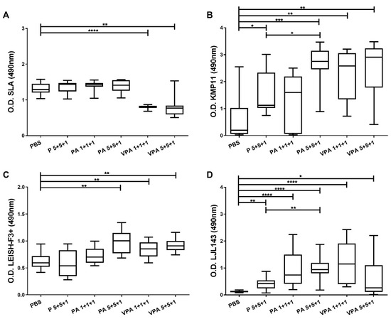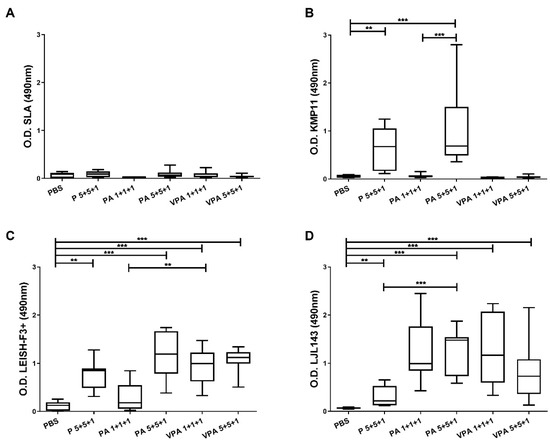 Similarly, with respect to LEISH-F3+, the presence of the adjuvant in the PA 5+5+1 group helped generate a stronger antibody response than that seen in the P 5+5+1 group. This response was greater than that recorded for the control group (p = 0.0028) and similar to that seen in the VPA 5+5+1 group (p = 0.0025). Of note, the antigen doses did not influence the reactivity when proteins were administered in VS (VPA 1+1+1 and VPA 5+5+1) (Figure 2C).