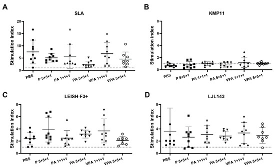 Antigen-specific lymphoproliferation assay in hamsters infected with L. infantum. Twelve weeks after infection, PBMCs were isolated from the peripheral blood of euthanized mice (n = 9 hamsters per group) and stimulated with SLA (A), KMP11 (B), LEISH-F3+ (C) or LJL143 (D) (10 µg/mL each) for 5 days at 37 °C. Lymphoproliferation was determined by the measurement of BrdU incorporation by ELISA. The results show the cell stimulation index—calculated as the ratio between the absorbance of antigen-stimulated cells and the result for non-stimulated cells (RPMI control)—of each animal in a scatter plot. Dotted lines represent the stimulation index obtained in the context of three naive hamsters.
