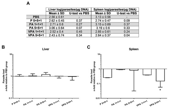To determine the efficacy of the proposed vaccine, the parasite load was measured by qPCR 12 weeks after infection in the target organs of VL. No differences were seen in the context of liver parasite burdens between immunized animals and controls (Figure 4A). Importantly, in the spleen, parasite load in the VPA 5+5+1 group was significantly lower—some 86% reduction—than in the control group (p = 0.0393) (Figure 4B).
