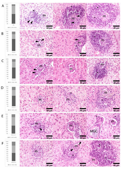 The efficiency of granuloma maturation and organization has been associated with the host capacity to resist infection in human, murine, and canine models [14,50,51,52]. Moreover, the effectiveness of protozoan vaccines has been related to the capacity to induce sterile granulomas [14]. Thus, granulomas were classified and counted as immature (developing granulomas), organized (distinct granulomas) or sterile (distinct, organized granulomas with central Kupffer cells and macrophages, surrounded by mixed inflammatory cells with a predominance of lymphocytes), according to previously reported classifications [14,51].