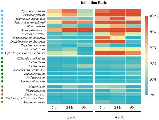 A heatmap presenting algaecidal spectrum and selectivity of ODTMA-Br (C18) at 2 and 4 μM. The inhibition ratio was calculated by the decrease in Fv/Fm value relative to control. A total of 24 cyanobacteria and eukaryotic algae, covering 12 Cyanobacteria (marked in blue cycles), 7 Chlorophyta (marked in green cycles) and 5 other eukaryotic algae (marked in brown cycles, including 2 Bacillariophyta, 2 Euglenozoa and 1 Cryptophyta) were used.