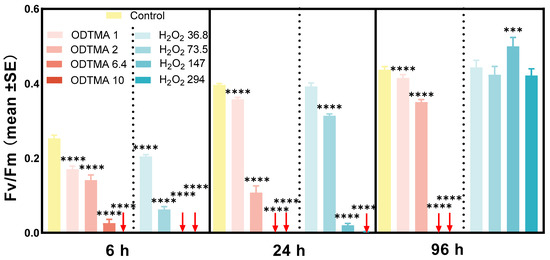 Photosynthetic activity changes (Fv/Fm) of site-collected Microcystis spp. colonies under ODTMA-Br (C18) and H2O2 treatments. Four concentrations of treatment were set for both ODTMA-Br (C18) (1, 2, 6.4 and 10 μM) and H2O2 (36.8, 73.5, 147 and 294 μM). The initial chl a concentration of each group was ca. 300 μg/L. Error bars indicate the standard deviation (n = 3). The asterisk indicates statistically significant differences in comparison with the control: ***, p < 0.005; ****, p < 0.001. Red arrows indicate the values of Fv/Fm were below the detection limit of the method.