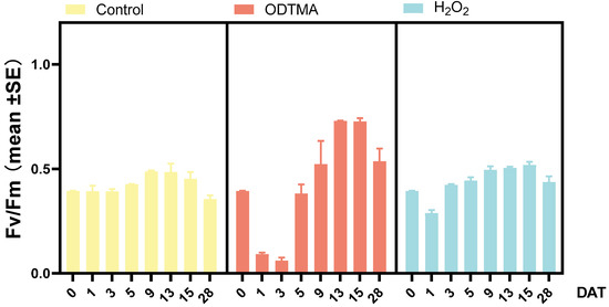 Temporal variations in photosynthetic activity (Fv/Fm) measured in Microcystis cultures maintained in mesocosms and exposed to a single dose of ODTMA-Br (C18) (6.4 μM) or H2O2 (117 μM).