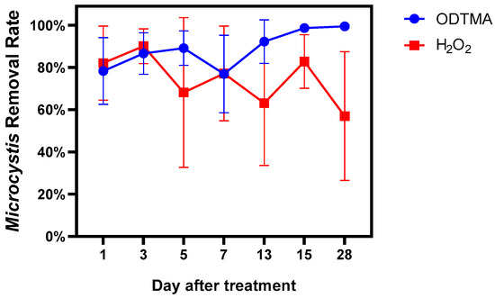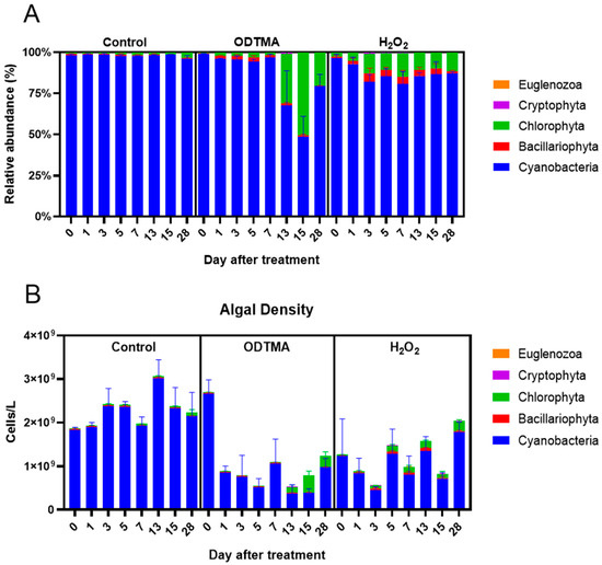 Figure 5A shows the proportion of the major phyla found in the mesocosms. Cyanobacteria accounted for more than 90% of the phytoplankton population in the untreated controls during the entire experiment. The cell densities of Cyanobacteria were 1.83 × 109 and 2.14 × 109 cells/L on days 0 and 28, respectively, in the untreated controls (Figure 5B). The addition of ODTMA-Br (C18) or H2O2 lowered the cyanobacteria cell count but raised the abundance of eukaryotic algae. These responses of the mesocosm population to H2O2 treatment are compatible with several studies showing that H2O2 can reduce the abundance of cyanobacteria relative to eukaryotic algae [32,33]. Total algal density in the ODTMA-Br (C18) group dropped to the lowest level on day 5, and the proportion of Chlorophyta was significantly higher on day 13. On day 15, Chlorophyta almost overtook that of Cyanobacteria as the dominant species (Figure 5A). In the H2O2 treatment, the cell density of Cyanobacteria dropped to the lowest level on day 3, the biomass of Bacillariophyta increased on day 1 and that of Chlorophyta increased on day 3. However, there was a significant rise in cyanobacterial biomass from day 5 in the H2O2 group. In terms of the duration of the cyanocidal effect, at the end of the experiment (day 28), despite the presence of a significant count of green algae in the H2O2 group, the cyanobacteria recovered to the original level on day 0. In contrast, cyanobacterial biomass in the ODTMA-Br (C18) group was reduced by nearly 50% compared to day 0. The removal rate of Microcystis cells (Figure 6) shows that the difference between ODTMA-Br (C18) and H2O2 treatments became distinct from day 7. As an example, on day 28, the Microcystis removal rate in ODTMA-Br (C18) treated mesocosms was 99. 5%, whereas it was only 57.0% after H2O2.