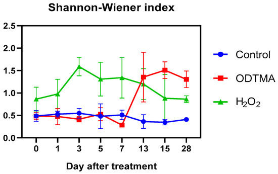 Species diversity indices (Shannon–Wiener) for ODTMA-Br (C18) and H2O2 treatment in the mesocosm experiment.
