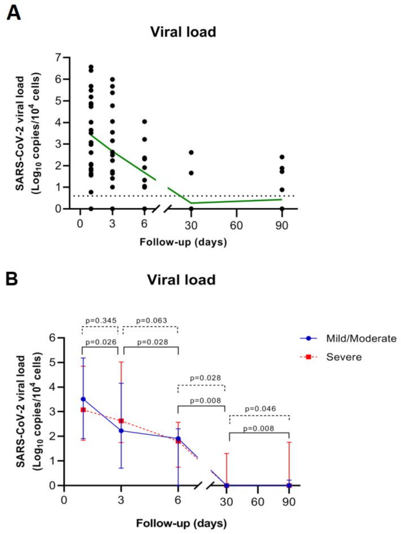 SARS-CoV-2 viral load kinetics. (A) SARS-CoV-2 RNA levels among the overall study population during the study period. The black dots represent the aligned individual values obtained from each time point. The green line represents the connected mean values. The dotted line indicates the established experimental threshold (below the lowest positive sample obtained in our study). (B) Median SARS-CoV-2 RNA levels in patients with mild/moderate versus severe COVID-19. The solid blue line with circles represents the mild/moderate group and dotted red line with squares represents the severe group. Wilcoxon signed rank test was performed for the decline of viral load between time points; p: p-value.