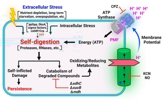 Although persister cell metabolism is significantly reduced compared to that of exponentially growing cells [13,37,102,103,233], persister cells must still undergo active energy metabolism in order to maintain their adenylate energy charge. Notably, there is evidence that self-digestion mediates the metabolism of persister cells, particularly those formed throughout the stationary phase (Figure 1). In fact, numerous independent studies have shown that persisters can harbor ETC activities [55,234], catabolize certain substrates to generate proton motive force (PMF) [234,235,236], produce energy molecules [237,238], and drive the futile production and degradation of RNA, leading to energy generation and dissipation [239]. Persister cells must also be able to repair antibiotic-induced damage to survive [16,17], and most repair mechanisms (e.g., DNA repair) are strongly ATP-dependent [240,241,242,243]. Further, a number of independent groups have shown that deletion of enzymes associated with the TCA cycle and ETC (e.g., sdhA, sucA, mdh) drastically reduce persister levels, indicating the importance of energy metabolism in persister cell formation and/or survival [21,55,244].