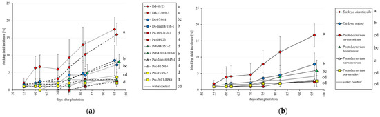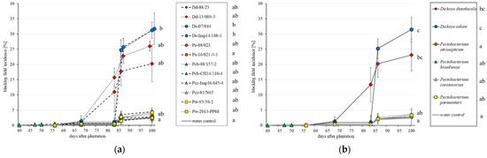 Timelines of the observed blackleg field incidence for the different 12 strains (a) and the different 6 species (b), average of two strains of similar color, in the field assay for 2018. Each single value of the timeline is the mean of four repetitions of 100 observed plants, with standard deviation bars. Different letters indicate statistical differences according to pairwise multiple comparison (ANOVA based) of the mean incidence value between the strains at the last observation. In the chart, letters are grouped together. Details statistical differences between strains or species are given right to the legends. Negative control with water is given in gray. The assay was repeated in 2020.