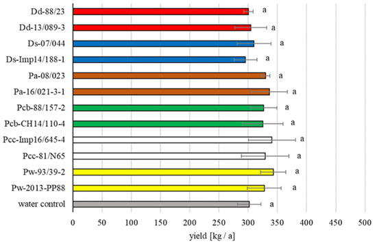 In the first field trial planted in early spring 2018 with artificially inoculated tubers, disease progression was monitored weekly until haulm destruction. In this trial, a regular progression of the disease was observed with both D. solani strains, both D. dianthicola strains and one P. brasiliense strain (Figure 1a). At the last observation, the incidence of blackleg symptoms for these strains was significantly higher than the water control in which some diseased plants were also observed. Both strains of D. dianthicola as well as both strains of D. solani presented similar disease progression curves. For P. brasiliense, the blackleg incidence of one strain differed from the water control, while the second strain did not significantly differ from the control. At the species level, D. solani and D. dianthicola were the two species that differed significantly from the water control (Figure 1b). No significant differences in yield were observed in the 2018 field assay (Figure 2).
