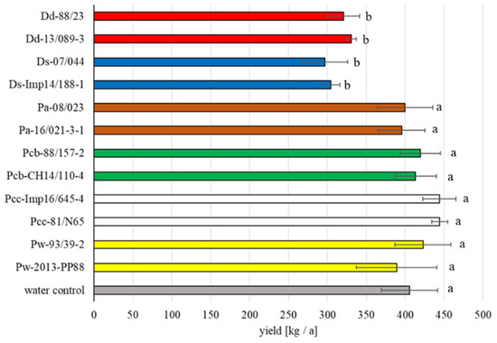 Yield in kg per are of the trials using potatoes infected with 12 bacterial strains in the field assay for 2020. Mean value of four repetitions for each strain, with standard deviation bars. Different letters indicate statistical differences according to pairwise multiple comparison (ANOVA based) of the mean incidence value between the strains. This is a repetition of the assay 2018.