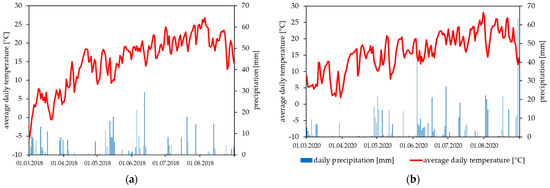 Meteorological data for the field trials Goumoens-la-Ville (VD, Switzerland) 2018 (a) and Reckenholz (ZH, Switzerland) 2020 (b). Average daily temperature (°C) and daily precipitation (mm) are given over a period, including the potato cultivation period.